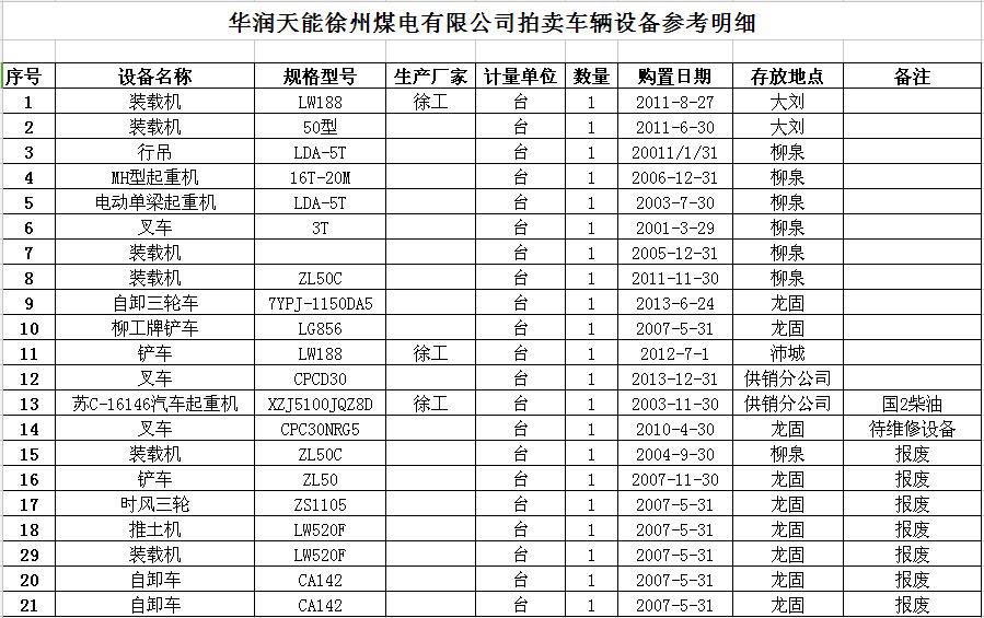 我公司受委托,定于2017年4月12日10時在徐州市中山南路55號7樓本公司大廳公開拍賣華潤天能徐州煤電有限公司各型車輛設(shè)備約二十余臺,主要包括各型裝載機(jī)、叉車、起重機(jī)、鏟車、推土機(jī)、自卸車等。