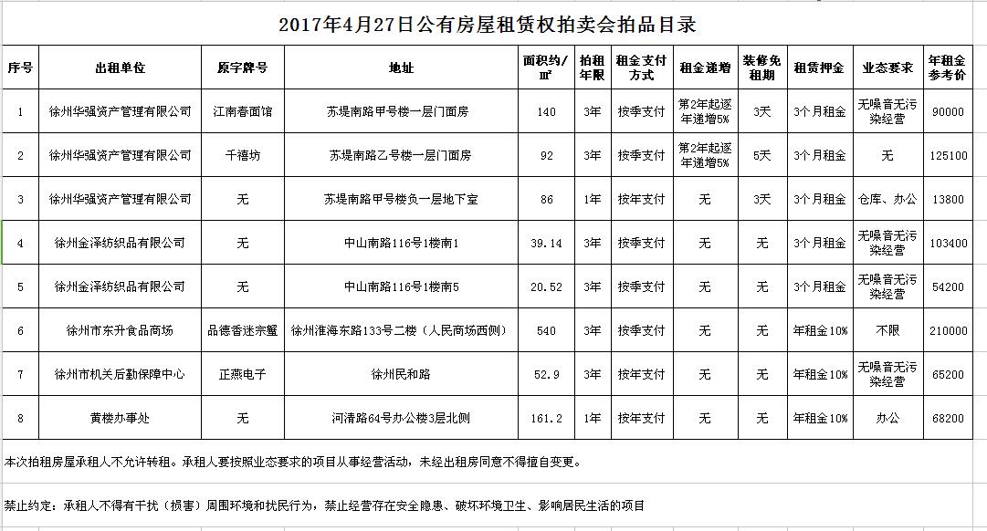 關(guān)注微信公眾號(hào)我公司受委托,定于2017年4月27日10時(shí)開始,通過中國(guó)拍賣行業(yè)協(xié)會(huì)網(wǎng)絡(luò)拍賣平臺(tái)(http://pm.caa123.org.cn),以網(wǎng)絡(luò)競(jìng)價(jià)的方式公開拍賣公有房屋租賃權(quán)一批,租賃期限均為3年,以下房屋均為空房: