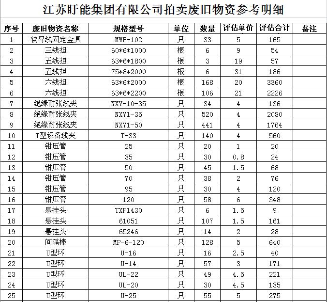 關(guān)注微信公眾號(hào)受江蘇盱能集團(tuán)有限公司委托,我公司將通過中國拍賣行業(yè)協(xié)會(huì)網(wǎng)絡(luò)拍賣平臺(tái)以網(wǎng)絡(luò)競價(jià)的方式公開拍賣廢舊物資一批,主要包括:電纜、金具、線管、開關(guān)等(詳見拍品目錄)。