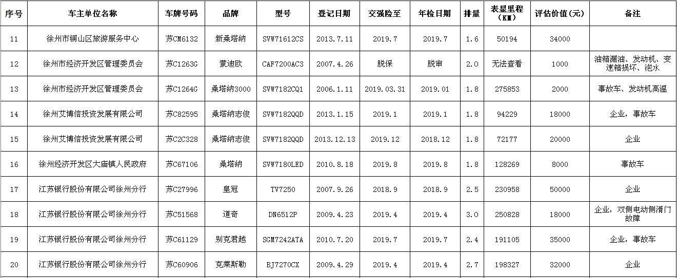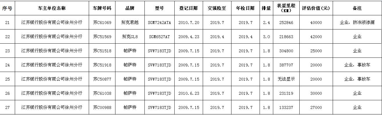 關(guān)注微信公眾號我公司受委托,定于2018年9月14日10時在中山南路55號三樓本公司拍賣廳公開拍賣:江蘇銀行股份有限公司徐州分行、徐州經(jīng)濟(jì)技術(shù)開發(fā)區(qū)、銅山區(qū)、云龍區(qū)公務(wù)車輛二十余輛。主要車型有帕薩特、皇冠、道奇、別克、克萊斯勒等。