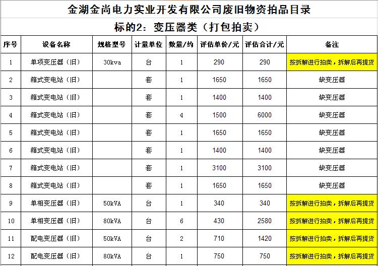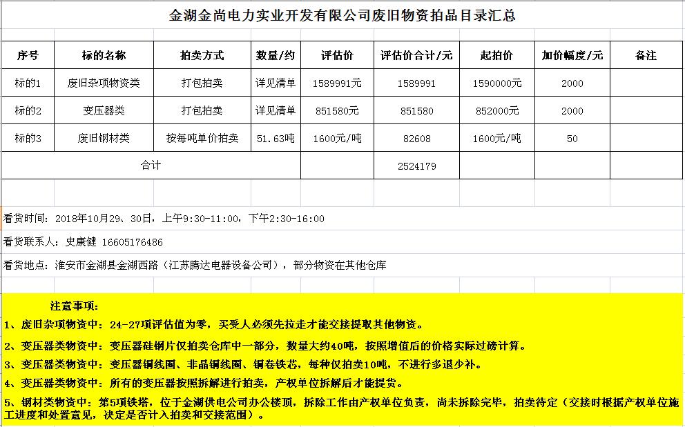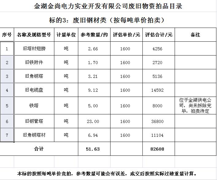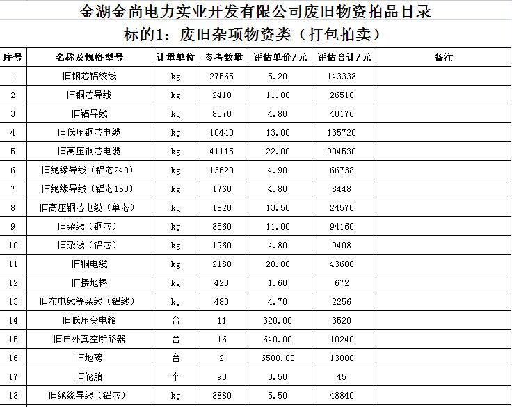 關(guān)注微信公眾號受金湖金尚電力實業(yè)開發(fā)有限公司委托,我公司將通過中國拍賣行業(yè)協(xié)會網(wǎng)絡(luò)拍賣平臺以網(wǎng)絡(luò)競價的方式公開拍賣廢舊物資一批,主要包括:電纜、導(dǎo)線、鋼芯鋁絞線、角鋼塔、鐵附件、金具、變壓器、箱式變電站、空調(diào)、電腦等(詳見拍品目錄)。