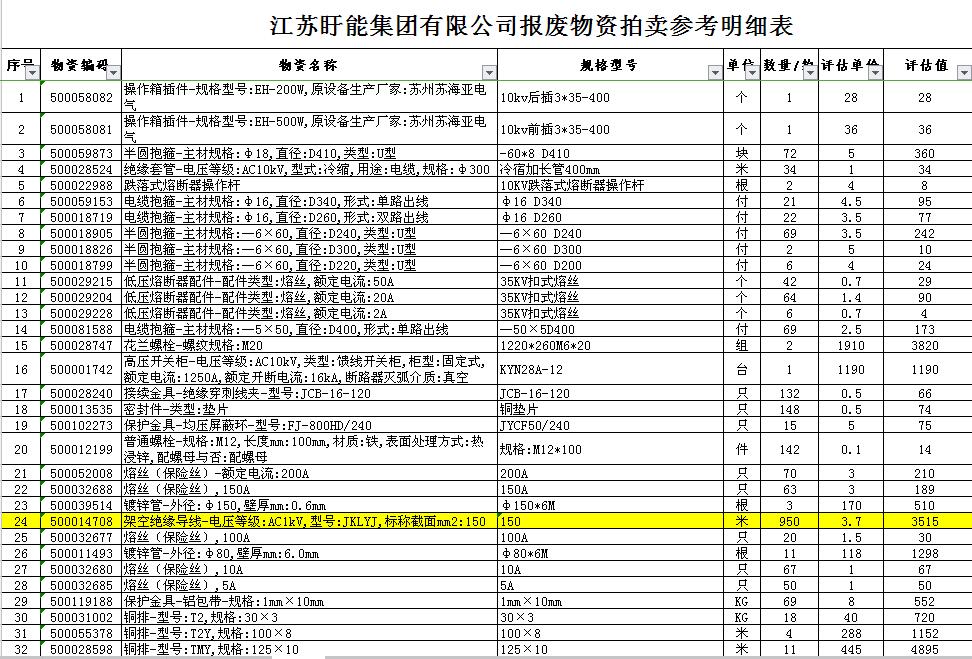 關(guān)注微信公眾號(hào)受江蘇盱能集團(tuán)有限公司委托,我公司將通過(guò)中國(guó)拍賣行業(yè)協(xié)會(huì)網(wǎng)絡(luò)拍賣平臺(tái)以網(wǎng)絡(luò)競(jìng)價(jià)的方式公開(kāi)拍賣以下廢舊物資,主要包括:各型廢舊電纜、變壓器拆解件、五金、金具、鋼芯鋁絞線、開(kāi)關(guān)、配電柜等。