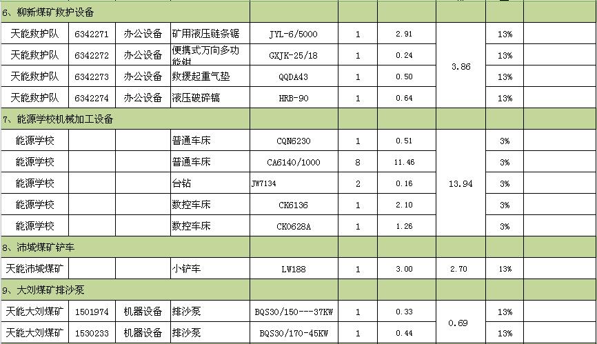 裝載機(jī)、通風(fēng)機(jī)、綜掘機(jī)、變壓器、鏟車、叉車、排沙泵、汽車衡、繪圖儀、救護(hù)設(shè)備、機(jī)械加工設(shè)備、測量設(shè)備等。