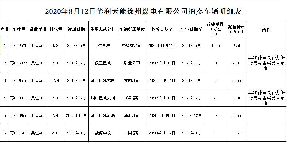 關(guān)注微信公眾號(hào)受委托,我公司定于2020年8月12日14:00時(shí)通過中拍平臺(tái)和現(xiàn)場(chǎng)結(jié)合方式公開拍賣:華潤(rùn)天能徐州煤電有限公司奧迪公務(wù)車6輛。