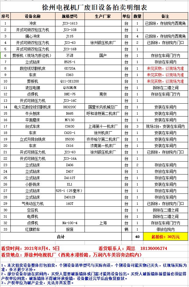 關(guān)注微信公眾號(hào)我公司受委托,定于2021年8月6日上午10時(shí)(延時(shí)除外)在中拍平臺(tái)公開(kāi)拍賣:徐州電視機(jī)廠廢舊設(shè)備一批。主要包含:沖床、壓力機(jī)、折邊機(jī)、鉆床、機(jī)床、車床、刨床、磨床、銑床等、空壓機(jī)、電焊機(jī)等。